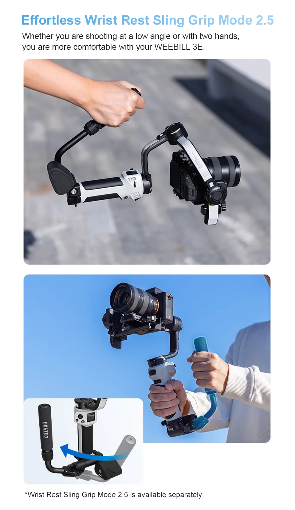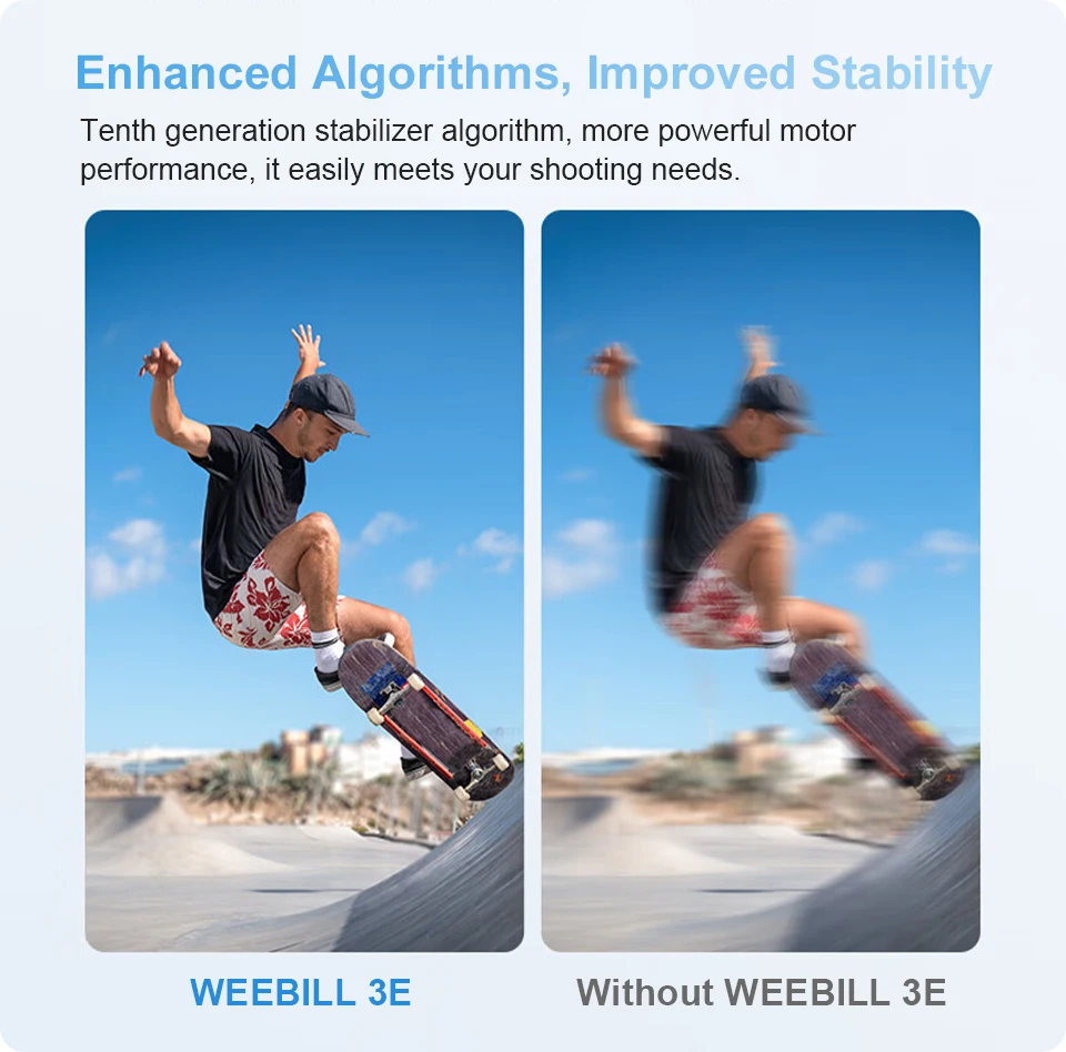 "Tão compacto quanto um papel A4, o WEEBILL 3E é o seu companheiro perfeito em qualquer lugar.O corpo compacto e a alça ergonomicamente projetada tornam-no uma alegria de transportar e usar, transformando sessões de filmagem de horas em uma brisa.