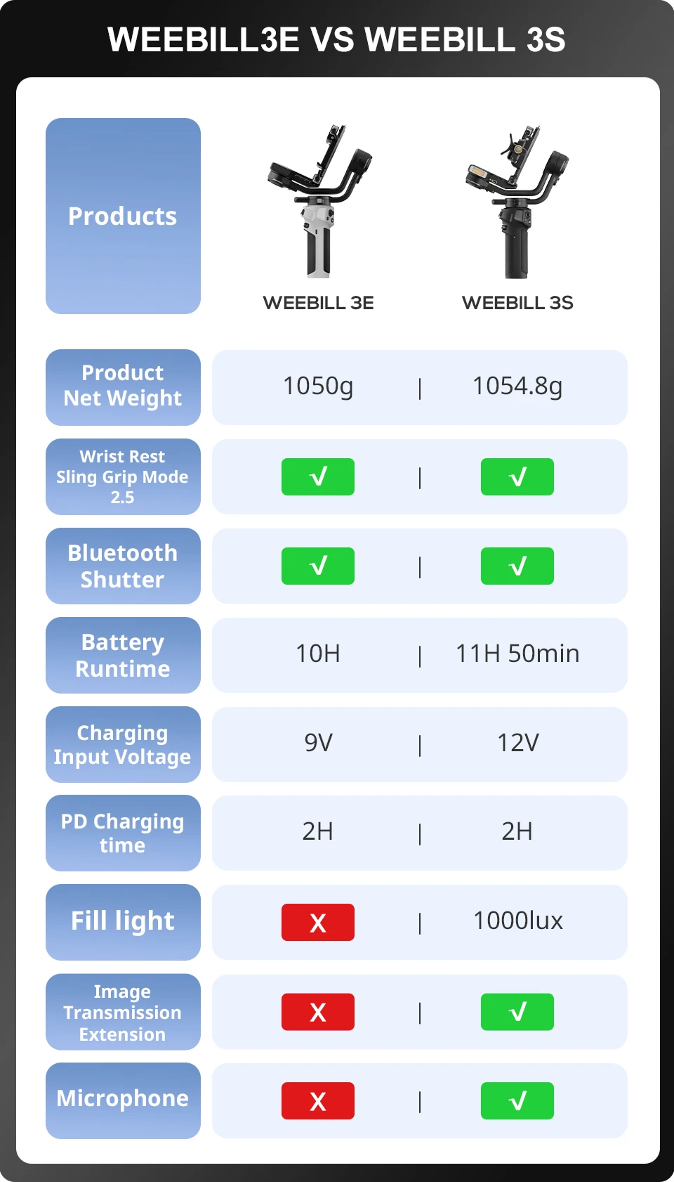 Qual é a diferença entre ZHIYUN CINPEER WEEBILL 3E e ZHIYUN WEEBILL 3S?