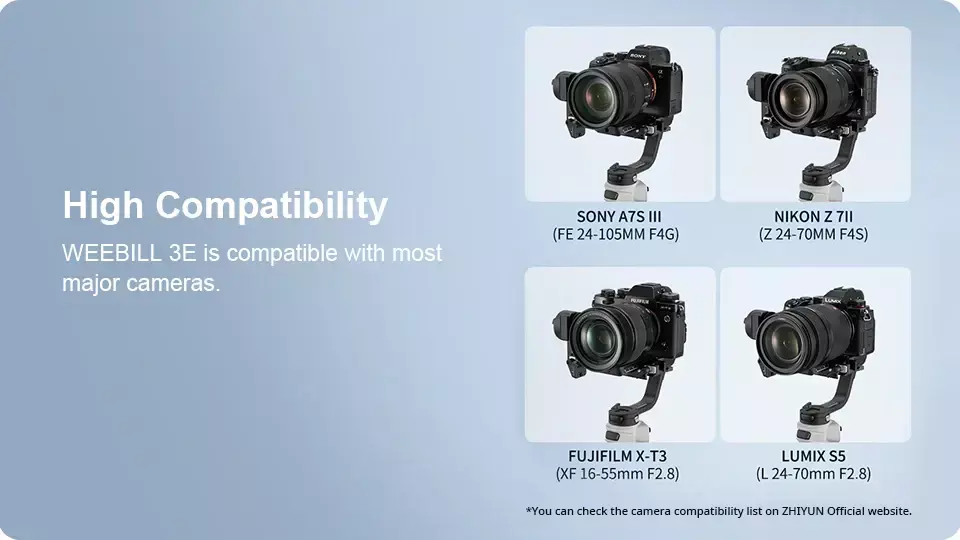 *Você pode verificar a lista de compatibilidade de câmeras no site oficial da ZHIYUN.